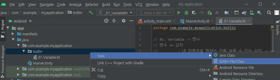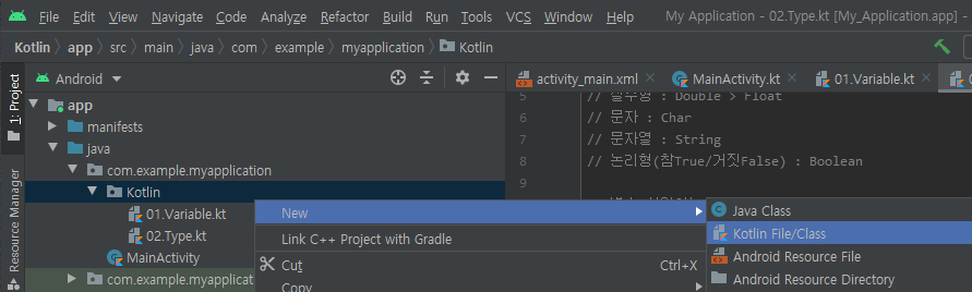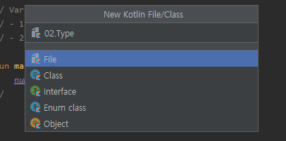 Kotlin 패키지 우클릭 > New > Kotlin File/Class