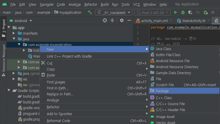 com.example.myapplication 패키지 우클릭 > New > Package