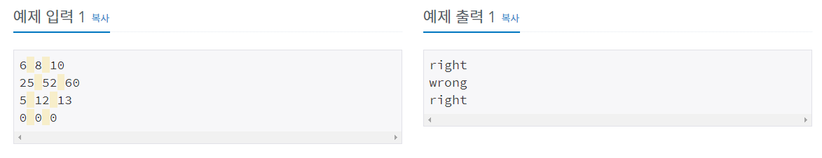 각 입력에 대해 직각 삼각형이 맞다면 "right", 아니라면 "wrong"을 출력한다.