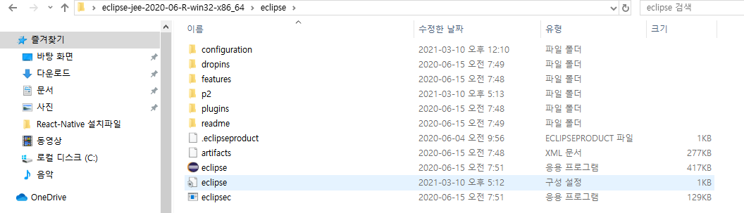 다운된 압축파일을 풀면 eclipse 폴더가 나온다