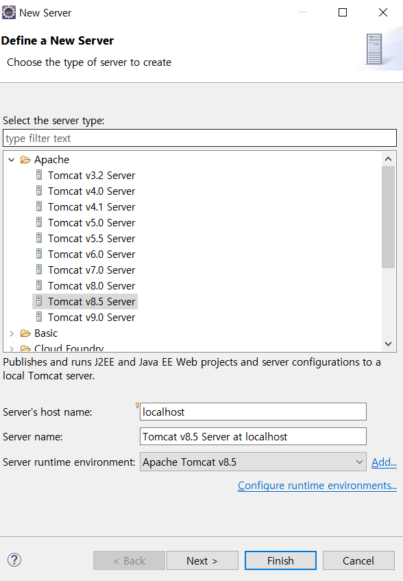 Apache 폴더에서 Tomcat v8.5 Server를 선택한다.