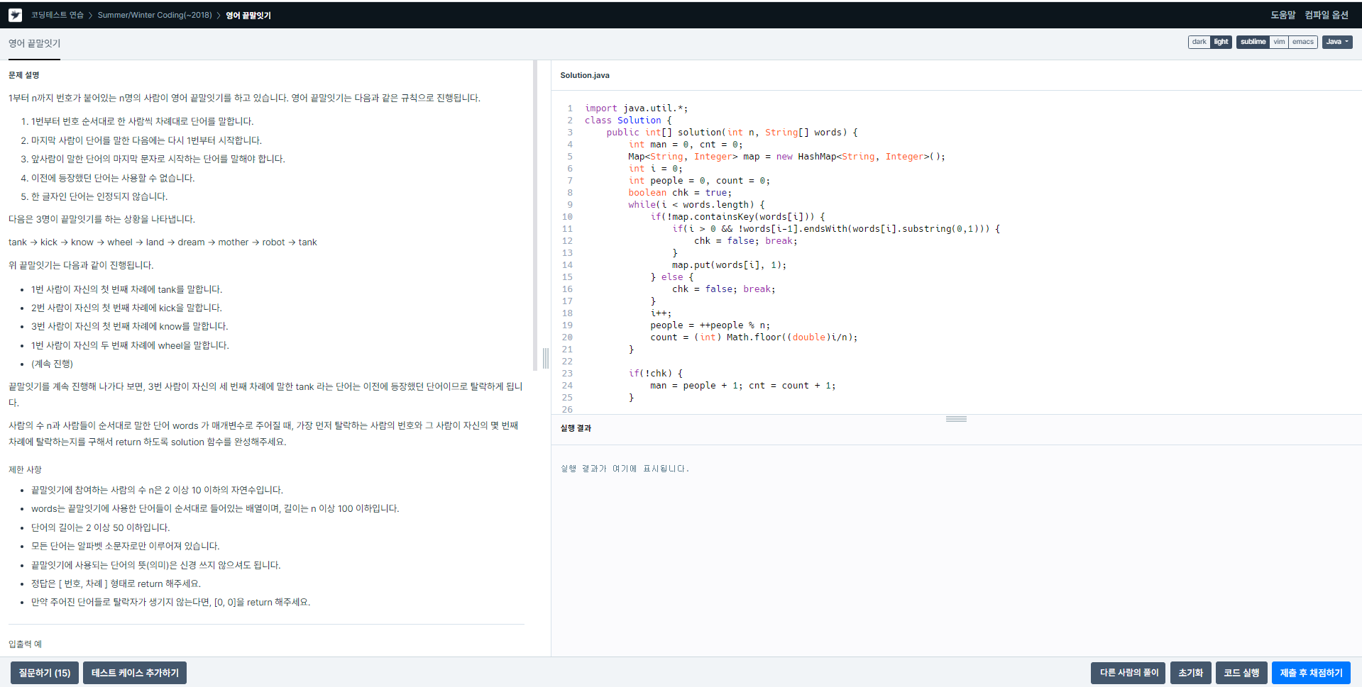 이번 포스팅은 프로그래머스 레벨 2 문제인 영어 끝말잇기를 풀어보겠습니다.