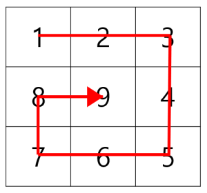 이때 수가 다음과 같은 순서로 배치되어있다면 이것을 n-소용돌이 수라고 부릅니다.