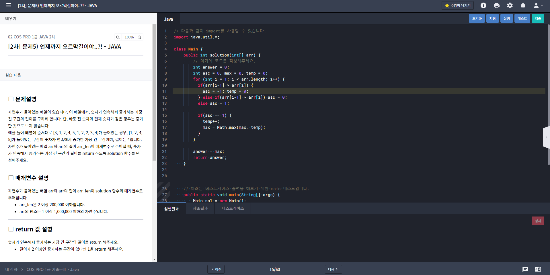 이번 포스팅은 Cos Pro 1급 java 2차 기출 5번 문제인 언제까지 오르막길이야...?!를 풀어보겠습니다.