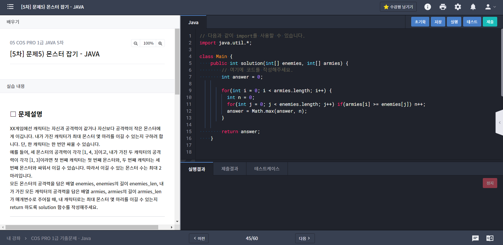 이번 포스팅은 Cos Pro 1급 Java 5차 기출 문제 중 5번 문제인 몬스터 잡기 문제를 풀어보도록 하겠습니다.