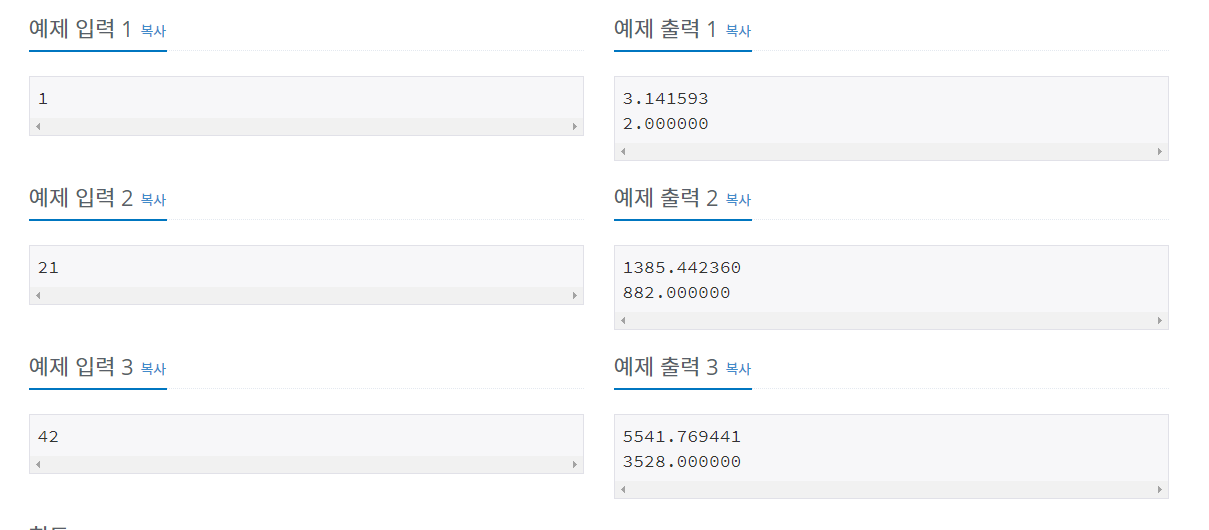 첫째 줄에는 유클리드 기하학에서 반지름이 R인 원의 넓이를, 둘째 줄에는 택시 기하학에서 반지름이 R인 원의 넓이를 출력한다. 정답과의 오차는 0.0001까지 허용한다.