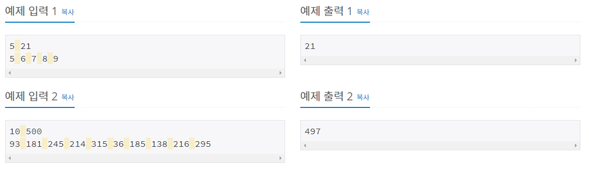 첫째 줄에 카드의 개수 N(3 ≤ N ≤ 100)과 M(10 ≤ M ≤ 300,000)이 주어진다. 둘째 줄에는 카드에 쓰여 있는 수가 주어지며, 이 값은 100,000을 넘지 않는 양의 정수이다.