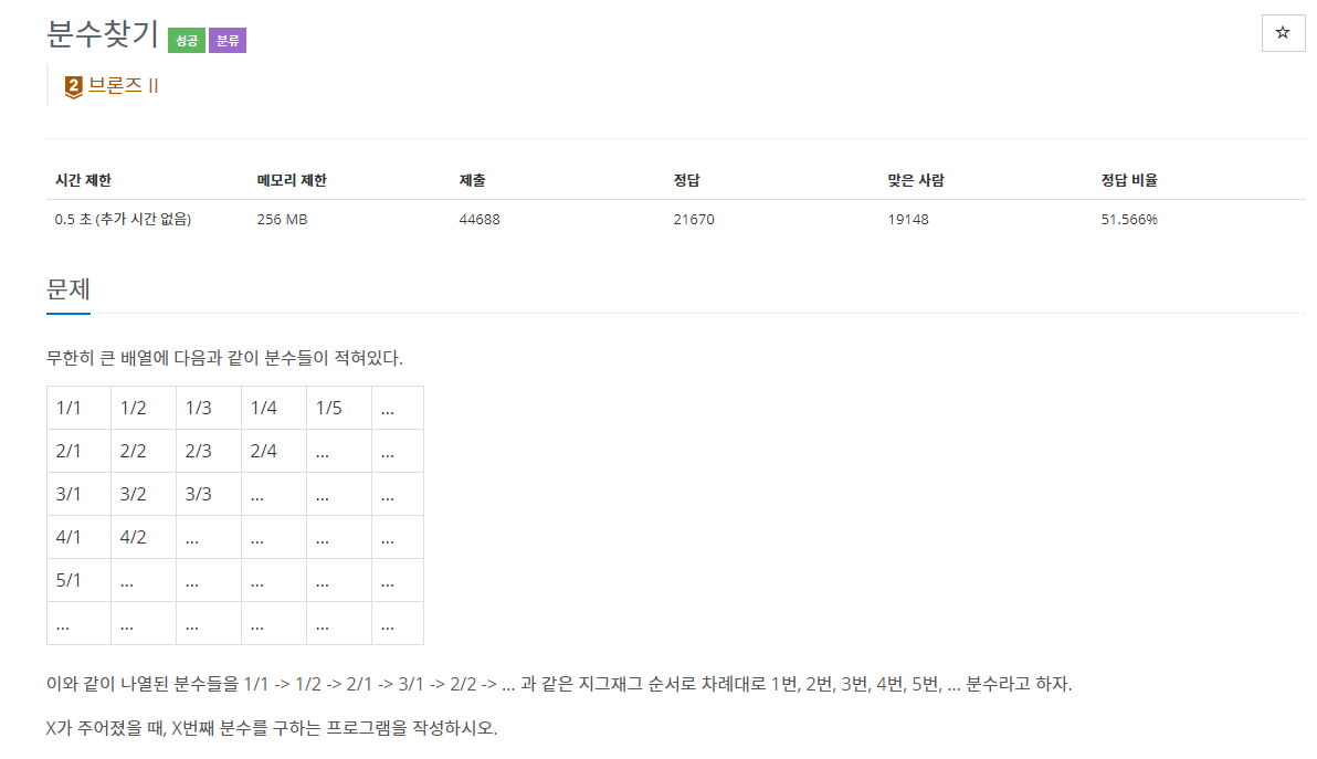 X가 주어졌을 때, X번째 분수를 구하는 프로그램을 작성하시오.
