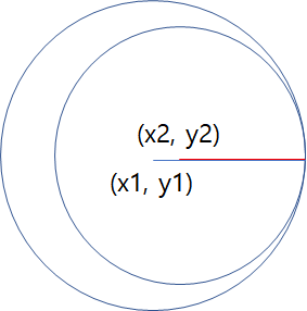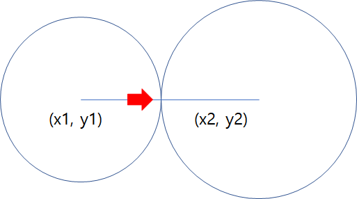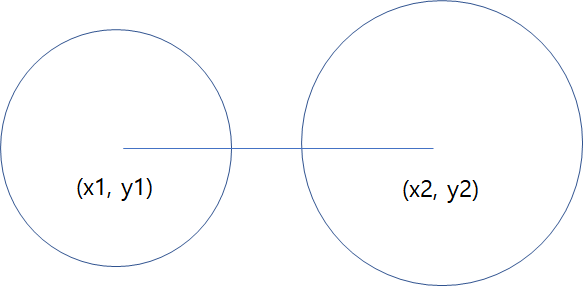 x1부터 x2까지, y1부터 y2까지의 거리를 구하려면? 두 원의 각 x, y값의 차에 대한 제곱의 합을 구해서 제곱근을 구하면 된다.