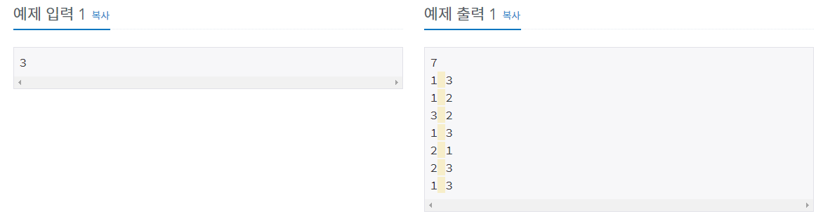 이 작업을 수행하는데 필요한 이동 순서를 출력하는 프로그램을 작성하라. 단, 이동 횟수는 최소가 되어야 한다.