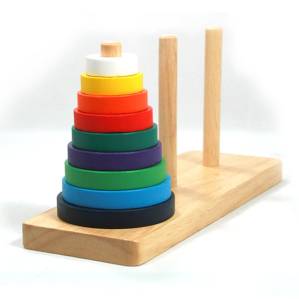 세 개의 장대가 있고 첫 번째 장대에는 반경이 서로 다른 n개의 원판이 쌓여 있다. 각 원판은 반경이 큰 순서대로 쌓여있다. 이제 수도승들이 다음 규칙에 따라 첫 번째 장대에서 세 번째 장대로 옮기려 한다.
