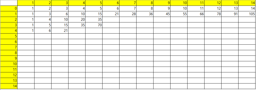 아파트에 비어있는 집은 없고 모든 거주민들이 이 계약 조건을 지키고 왔다고 가정했을 때, 주어지는 양의 정수 k와 n에 대해 k층에 n호에는 몇 명이 살고 있는지 출력하라. 단, 아파트에는 0층부터 있고 각층에는 1호부터 있으며, 0층의 i호에는 i명이 산다.