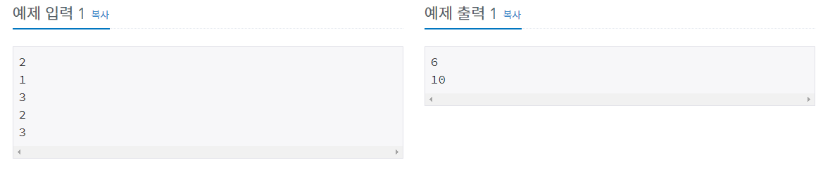첫 번째 줄에 Test case의 수 T가 주어진다. 그리고 각각의 케이스마다 입력으로 첫 번째 줄에 정수 k, 두 번째 줄에 정수 n이 주어진다