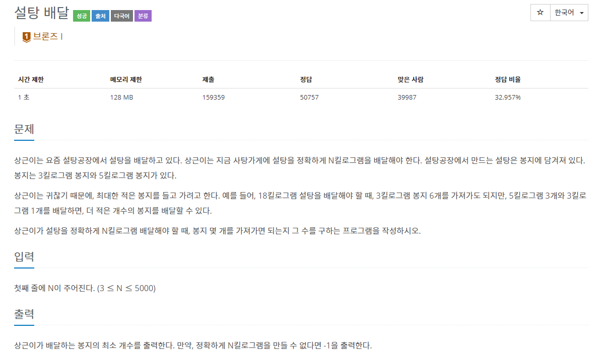 상근이는 요즘 설탕공장에서 설탕을 배달하고 있다. 상근이는 지금 사탕가게에 설탕을 정확하게 N킬로그램을 배달해야 한다. 설탕공장에서 만드는 설탕은 봉지에 담겨져 있다. 봉지는 3킬로그램 봉지와 5킬로그램 봉지가 있다.