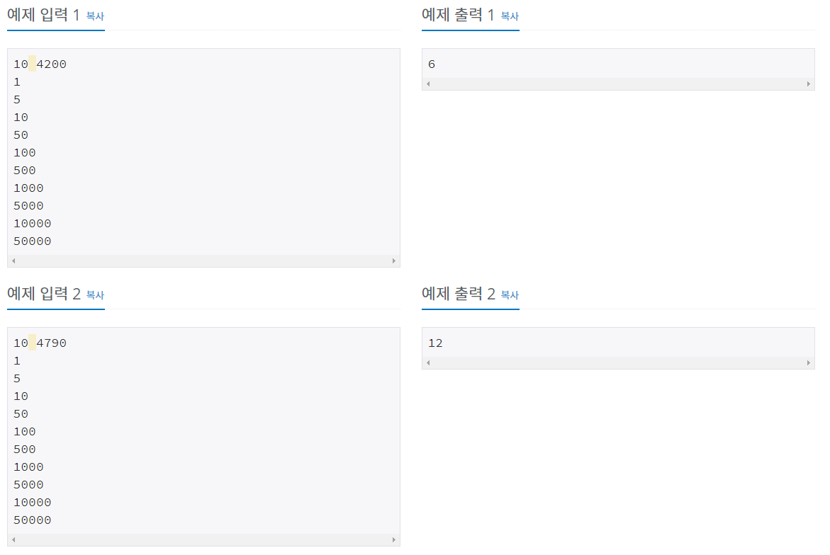 준규가 가지고 있는 동전은 총 N종류이고, 각각의 동전을 매우 많이 가지고 있다.