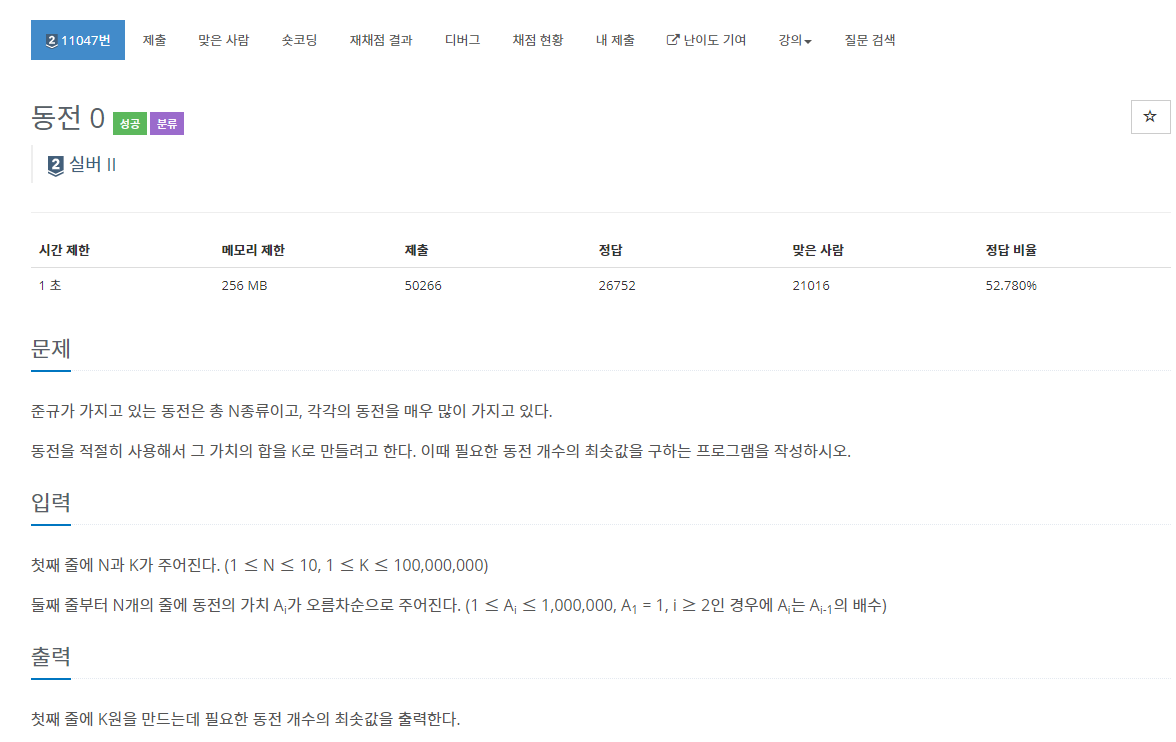 동전을 적절히 사용해서 그 가치의 합을 K로 만들려고 한다. 이때 필요한 동전 개수의 최솟값을 구하는 프로그램을 작성하시오.