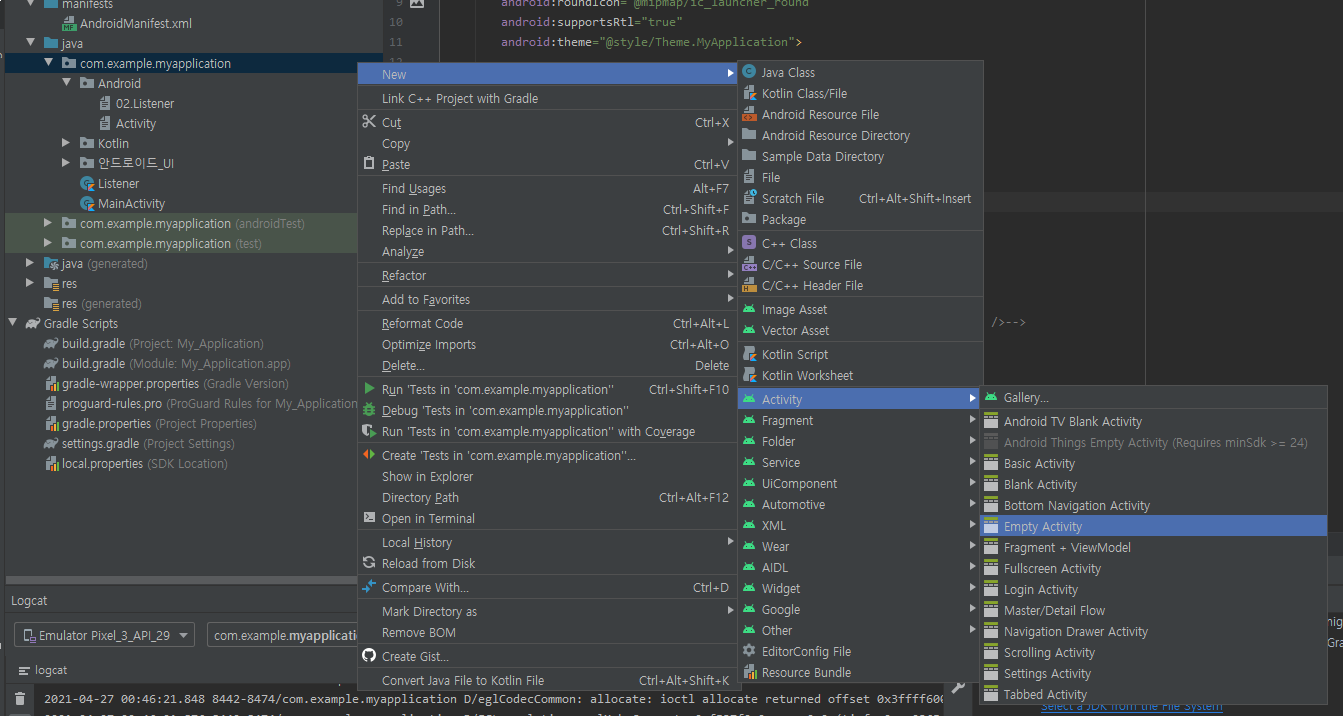 패키지 -> New -> Activity -> Empty Activity
