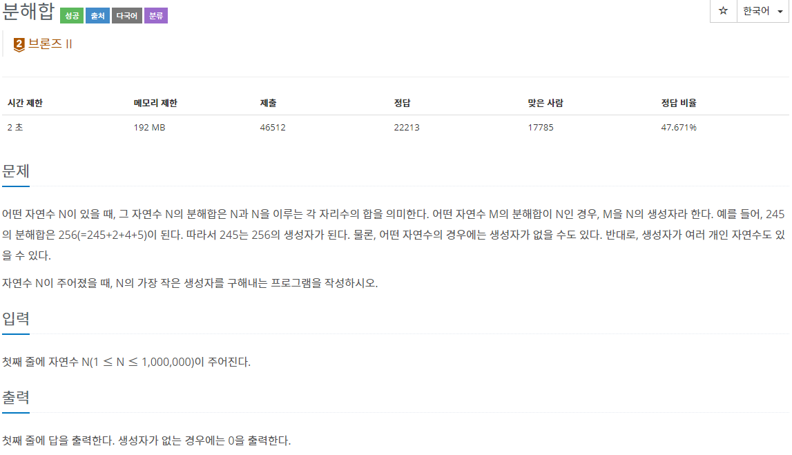 어떤 자연수 N이 있을 때, 그 자연수 N의 분해합은 N과 N을 이루는 각 자리수의 합을 의미한다. 어떤 자연수 M의 분해합이 N인 경우, M을 N의 생성자라 한다. 예를 들어, 245의 분해합은 256(=245+2+4+5)이 된다. 따라서 245는 256의 생성자가 된다. 물론, 어떤 자연수의 경우에는 생성자가 없을 수도 있다. 반대로, 생성자가 여러 개인 자연수도 있을 수 있다.