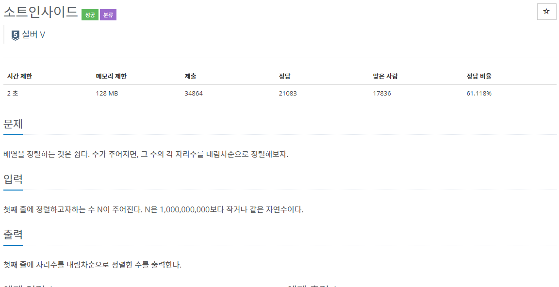 배열을 정렬하는 것은 쉽다. 수가 주어지면, 그 수의 각 자리수를 내림차순으로 정렬해보자.