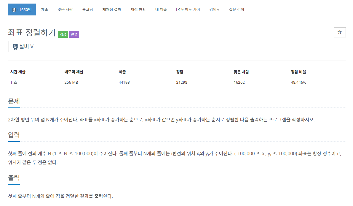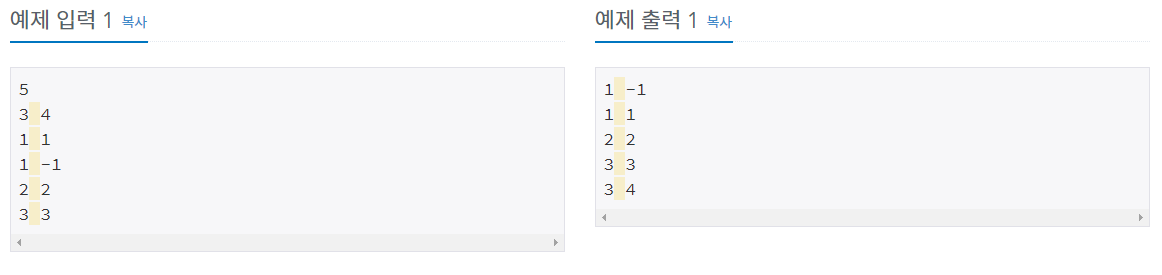 2차원 평면 위의 점 N개가 주어진다. 좌표를 x좌표가 증가하는 순으로, x좌표가 같으면 y좌표가 증가하는 순서로 정렬한 다음 출력하는 프로그램을 작성하시오.