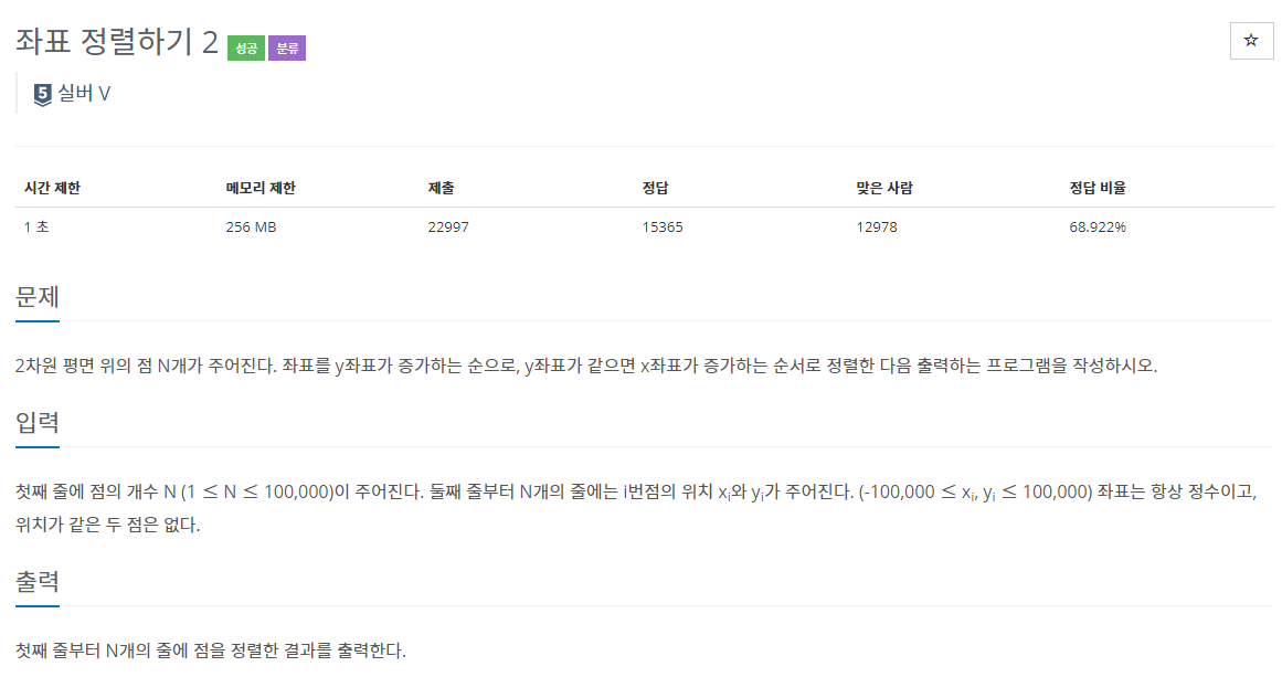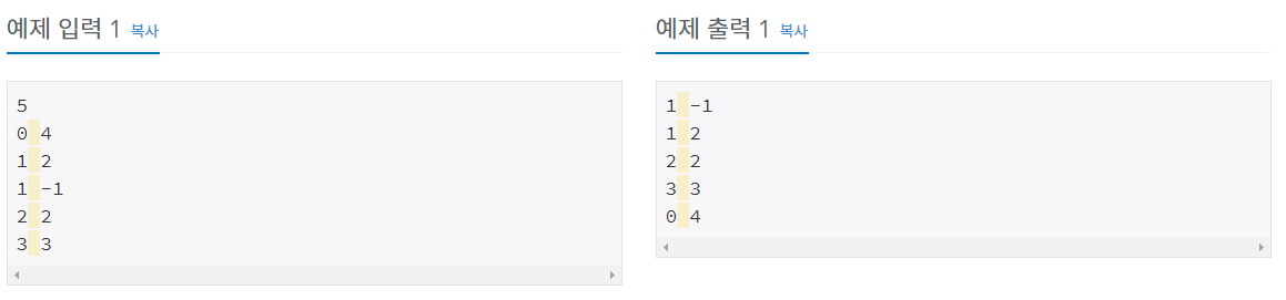 2차원 평면 위의 점 N개가 주어진다. 좌표를 y좌표가 증가하는 순으로, y좌표가 같으면 x좌표가 증가하는 순서로 정렬한 다음 출력하는 프로그램을 작성하시오.