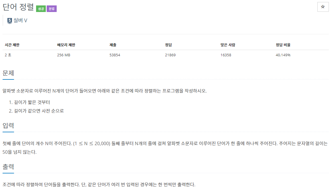 조건에 따라 정렬하여 단어들을 출력한다. 단, 같은 단어가 여러 번 입력된 경우에는 한 번씩만 출력한다.