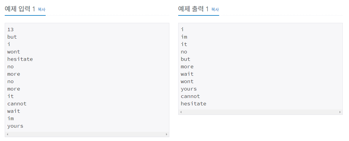 첫째 줄에 단어의 개수 N이 주어진다. (1 ≤ N ≤ 20,000) 둘째 줄부터 N개의 줄에 걸쳐 알파벳 소문자로 이루어진 단어가 한 줄에 하나씩 주어진다. 주어지는 문자열의 길이는 50을 넘지 않는다.