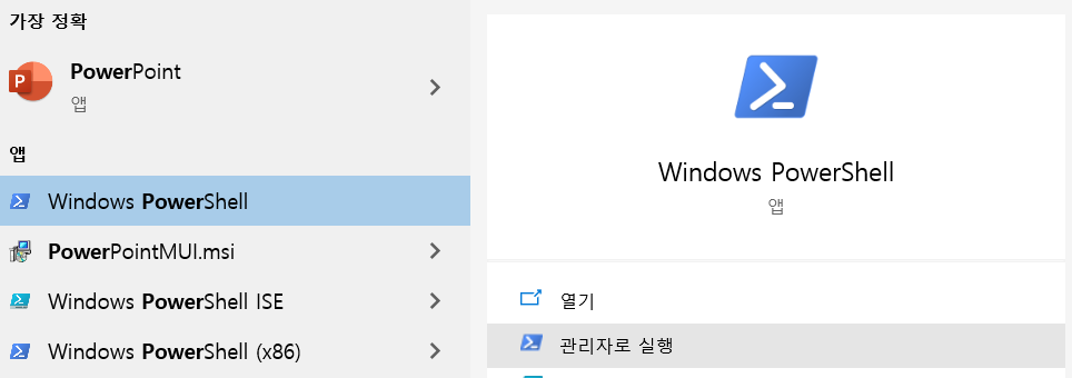 다운로드를 실행하기 전, 먼저 Windows PowerShell을 관리자 모드로 실행한다.