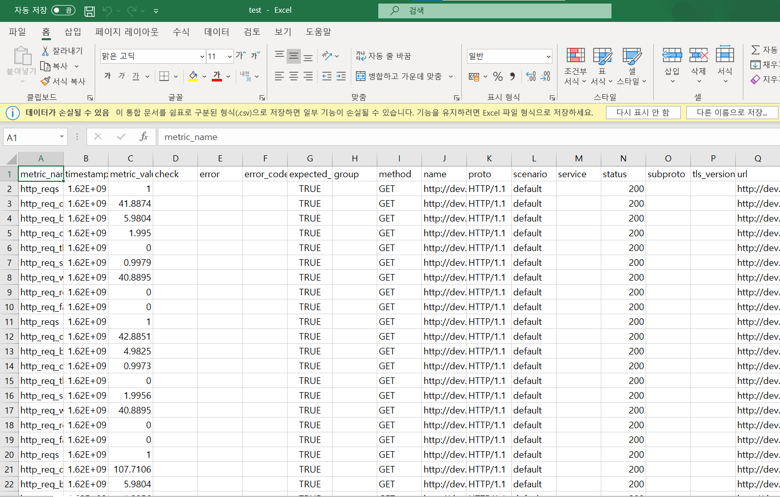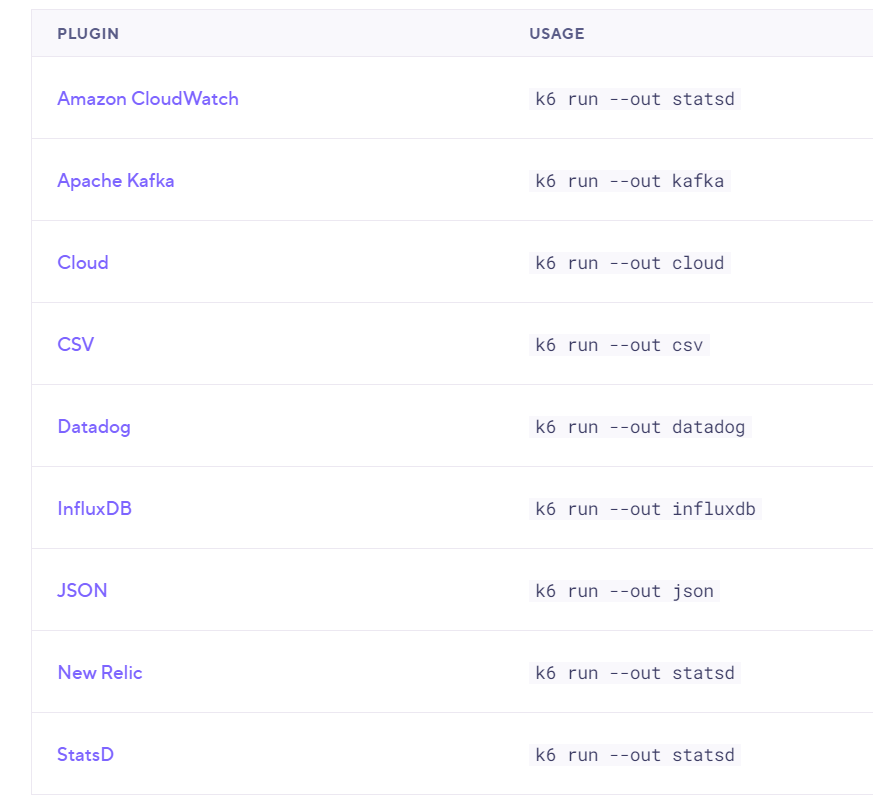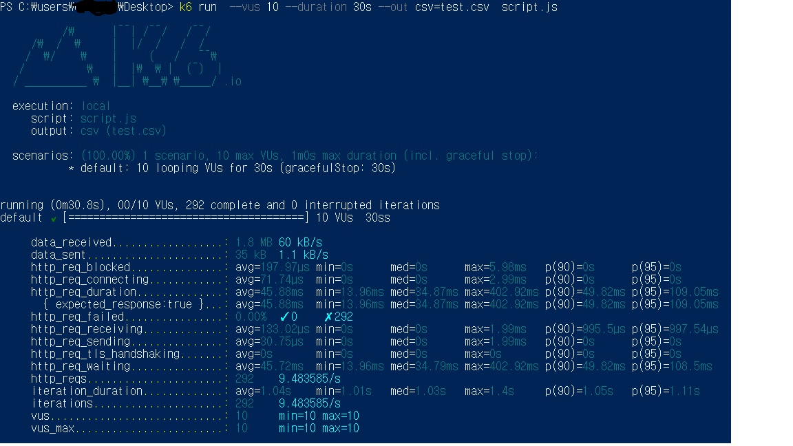 k6 run --vus 10(가상 사용자 수) --duration 30s(부하시간) --out csv=test.csv(출력되는 결과물 형식) script.js(실행할 스크립트)