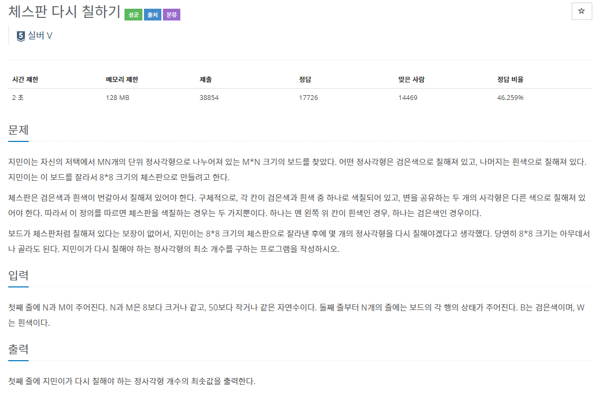 지민이는 자신의 저택에서 MN개의 단위 정사각형으로 나누어져 있는 M*N 크기의 보드를 찾았다. 어떤 정사각형은 검은색으로 칠해져 있고, 나머지는 흰색으로 칠해져 있다. 지민이는 이 보드를 잘라서 8*8 크기의 체스판으로 만들려고 한다.
