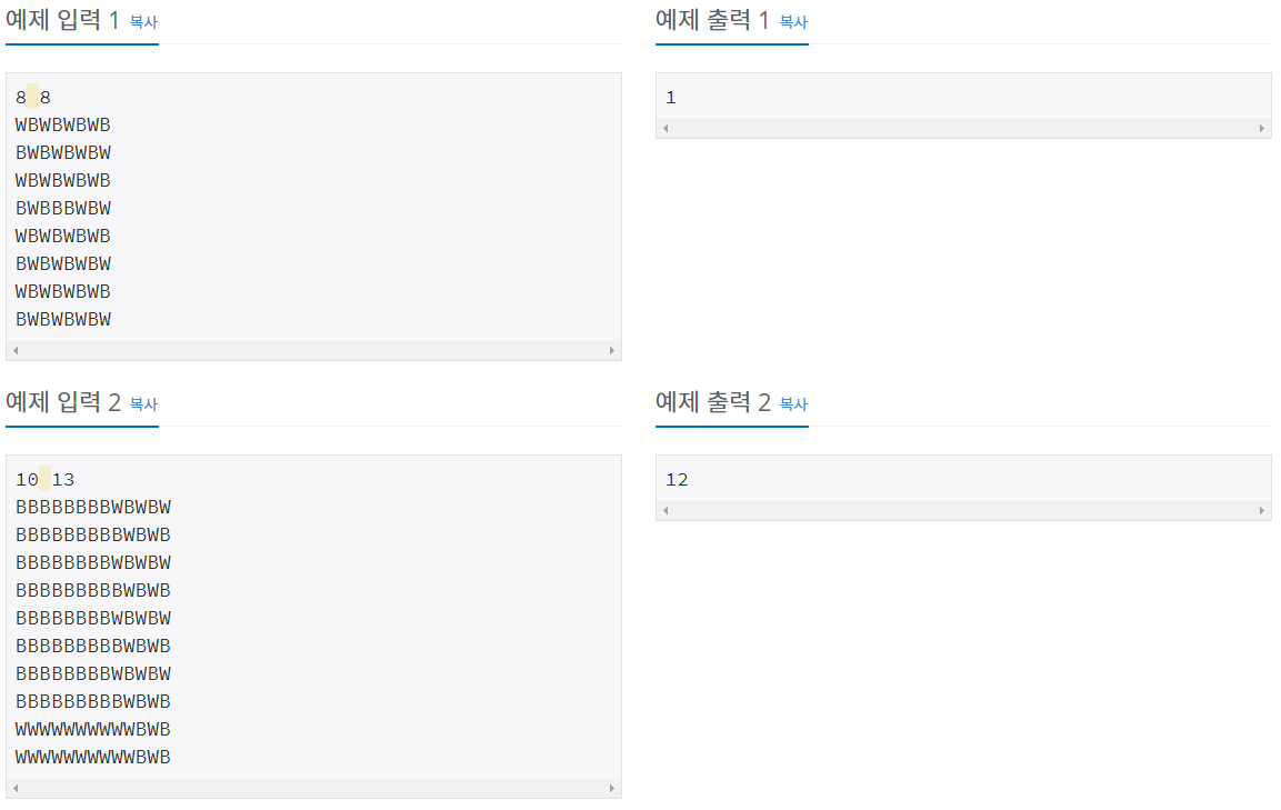 첫째 줄에 N과 M이 주어진다. N과 M은 8보다 크거나 같고, 50보다 작거나 같은 자연수이다. 둘째 줄부터 N개의 줄에는 보드의 각 행의 상태가 주어진다. B는 검은색이며, W는 흰색이다.