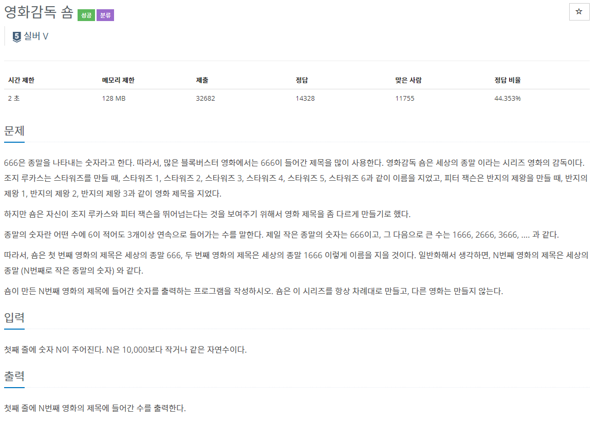 : 말그대로 브루트 포스, 무차별 대입을 하면 된다. 제일 첫번째 값이 666이니 666부터 1씩 더해서 666이 포함된 수를 구하면 된다.