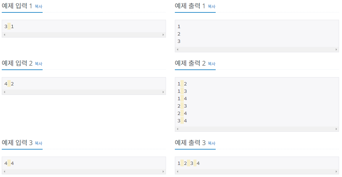 첫째 줄에 자연수 N과 M이 주어진다. (1 ≤ M ≤ N ≤ 8)