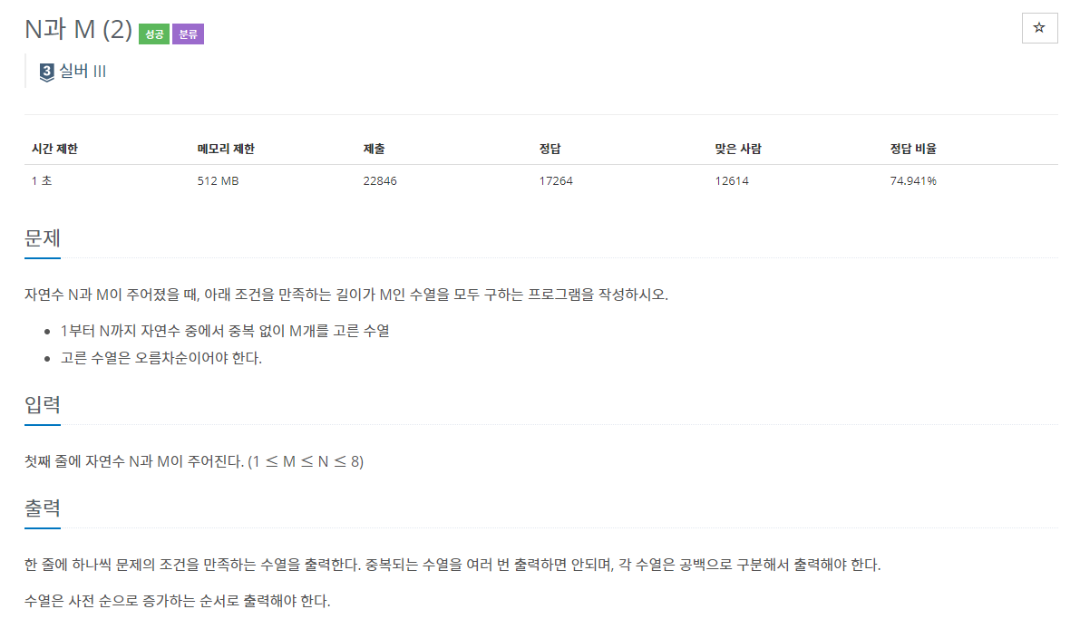 - 1부터 N까지 자연수 중에서 중복 없이 M개를 고른 수열