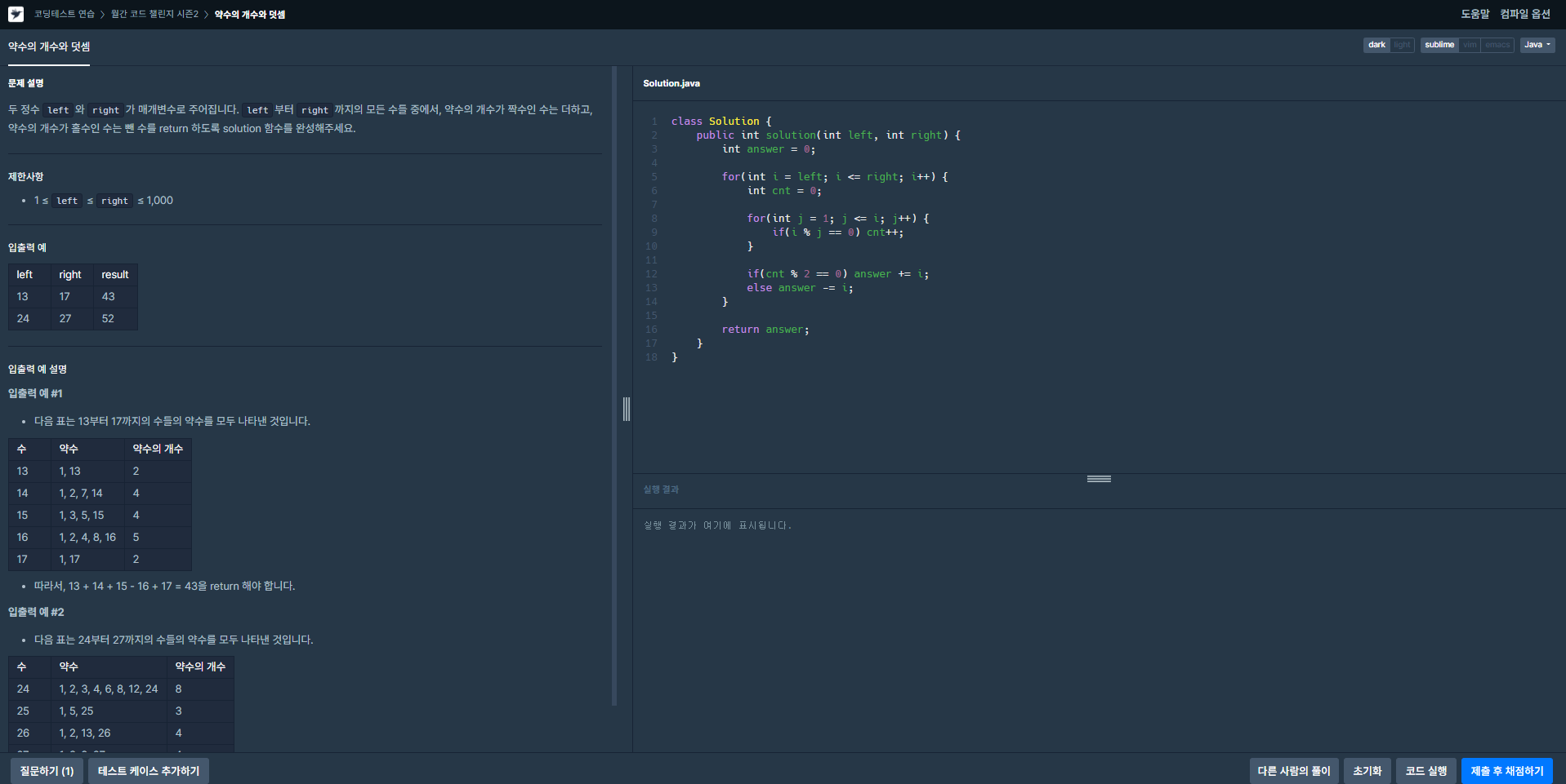 두 정수 left와 right가 매개변수로 주어집니다. left부터 right까지의 모든 수들 중에서, 약수의 개수가 짝수인 수는 더하고, 약수의 개수가 홀수인 수는 뺀 수를 return 하도록 solution 함수를 완성해주세요.