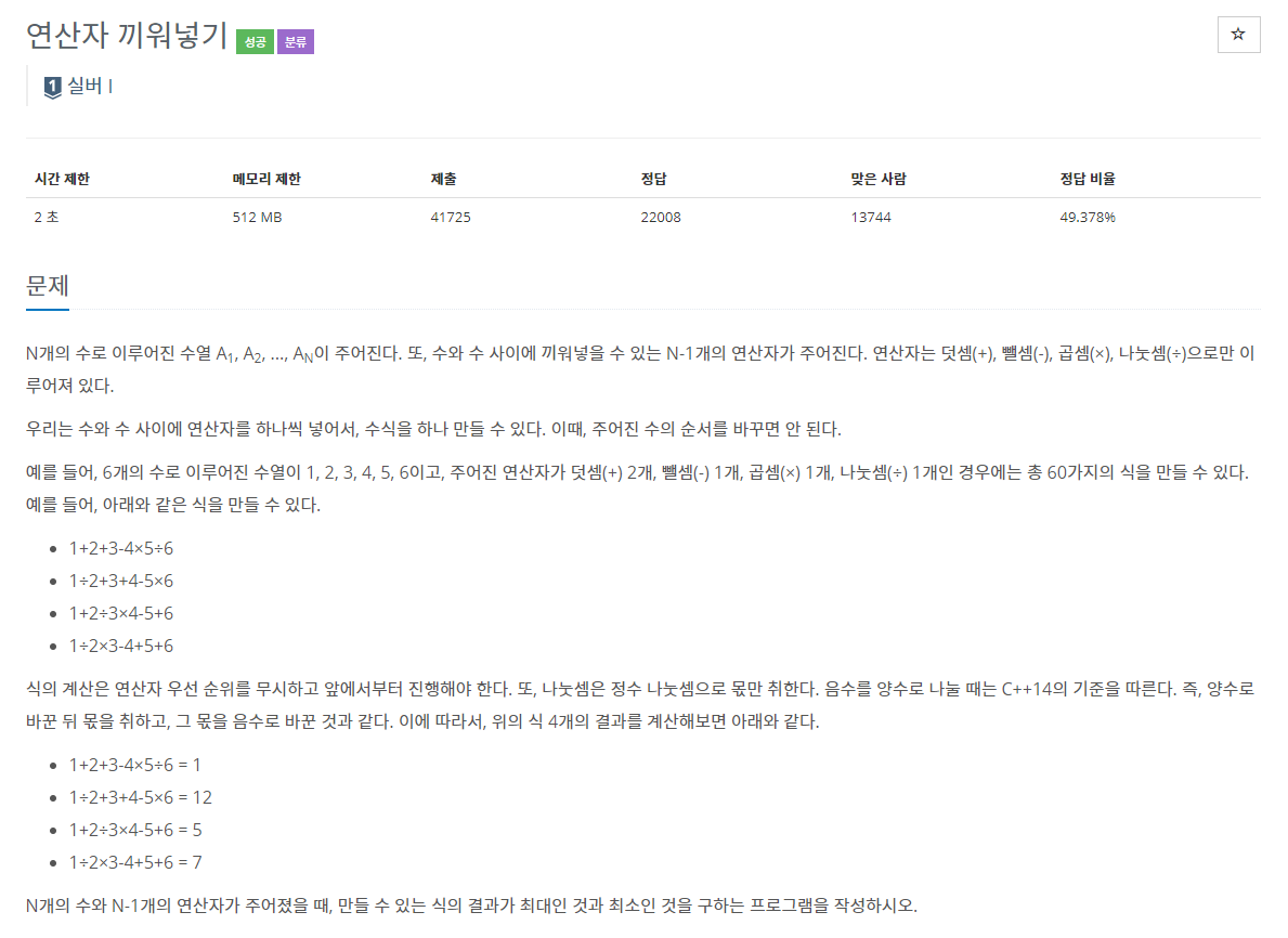N개의 수로 이루어진 수열 A1, A2, ..., AN이 주어진다. 또, 수와 수 사이에 끼워넣을 수 있는 N-1개의 연산자가 주어진다. 연산자는 덧셈(+), 뺄셈(-), 곱셈(×), 나눗셈(÷)으로만 이루어져 있다.