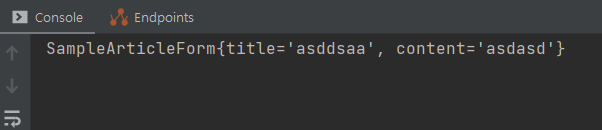 이제 createArticle 메서드에 DTO로 만든 SampleArticleForm을 파라미터로 넣어서 컨트롤러에서 출력해본다.