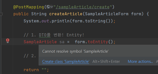 그런데 기존에는 SampleArticle 이란 클래스를 정의한 적도 없고, form 객체인 SampleArticleForm 클래스에 toEntity라는메서드도 없다.