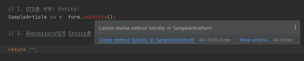 이제 다시 SampleArticleController에서 dto의 toEntity() 메서드를 구현해보도록 하자.