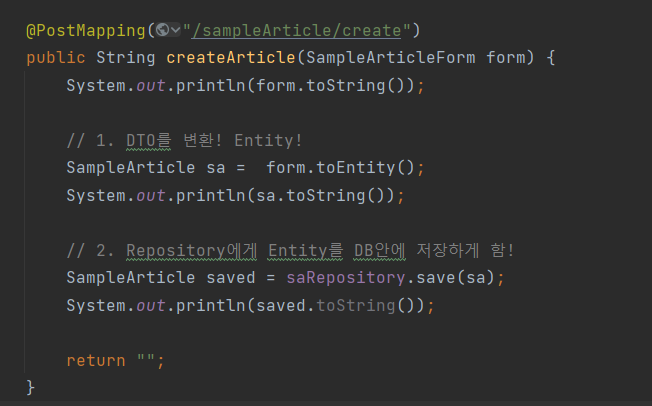 SampleArticle sa = form.toEntity(); 가 쓰인 것을 볼 수 있다.