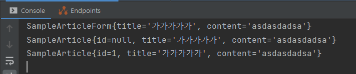 SampleArticle sa = form.toEntity(); 가 쓰인 것을 볼 수 있다.