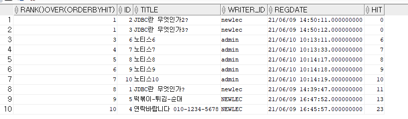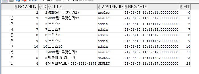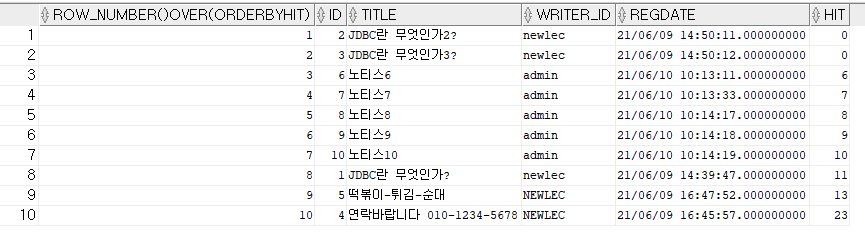SELECT ROWNUM, ID, TITLE, WRITER_ID, REGDATE, HIT