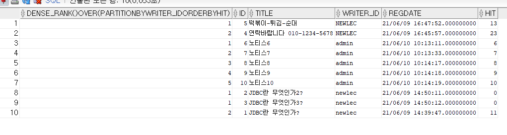 SELECT DENSE_RANK() OVER (PARTITION BY WRITER_ID ORDER BY HIT) , ID, TITLE, WRITER_ID, REGDATE, HIT