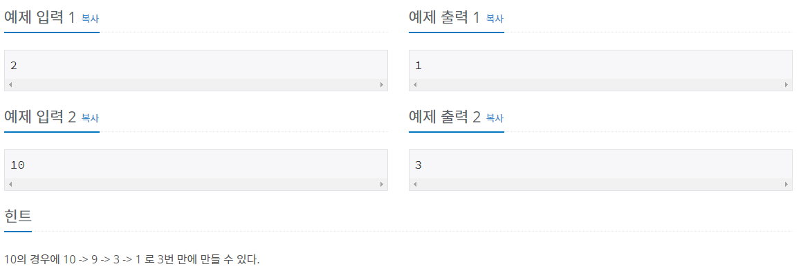 정수 N이 주어졌을 때, 위와 같은 연산 세 개를 적절히 사용해서 1을 만들려고 한다. 연산을 사용하는 횟수의 최솟값을 출력하시오.