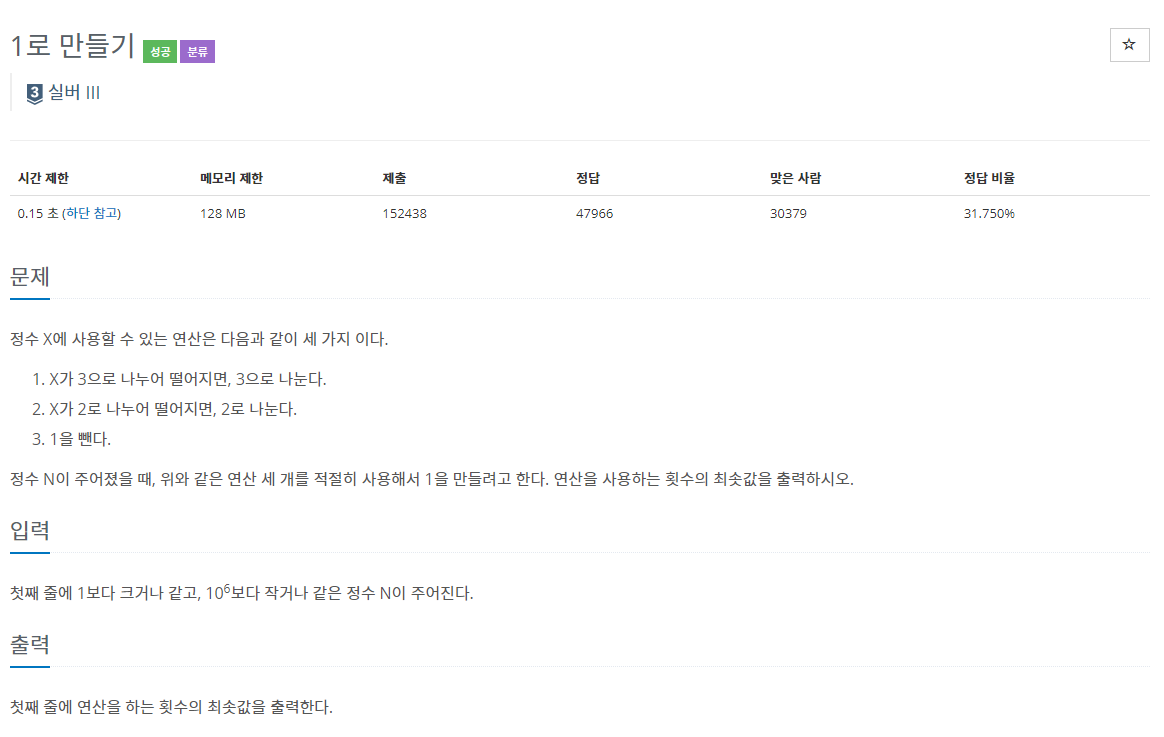 정수 N이 주어졌을 때, 위와 같은 연산 세 개를 적절히 사용해서 1을 만들려고 한다. 연산을 사용하는 횟수의 최솟값을 출력하시오.