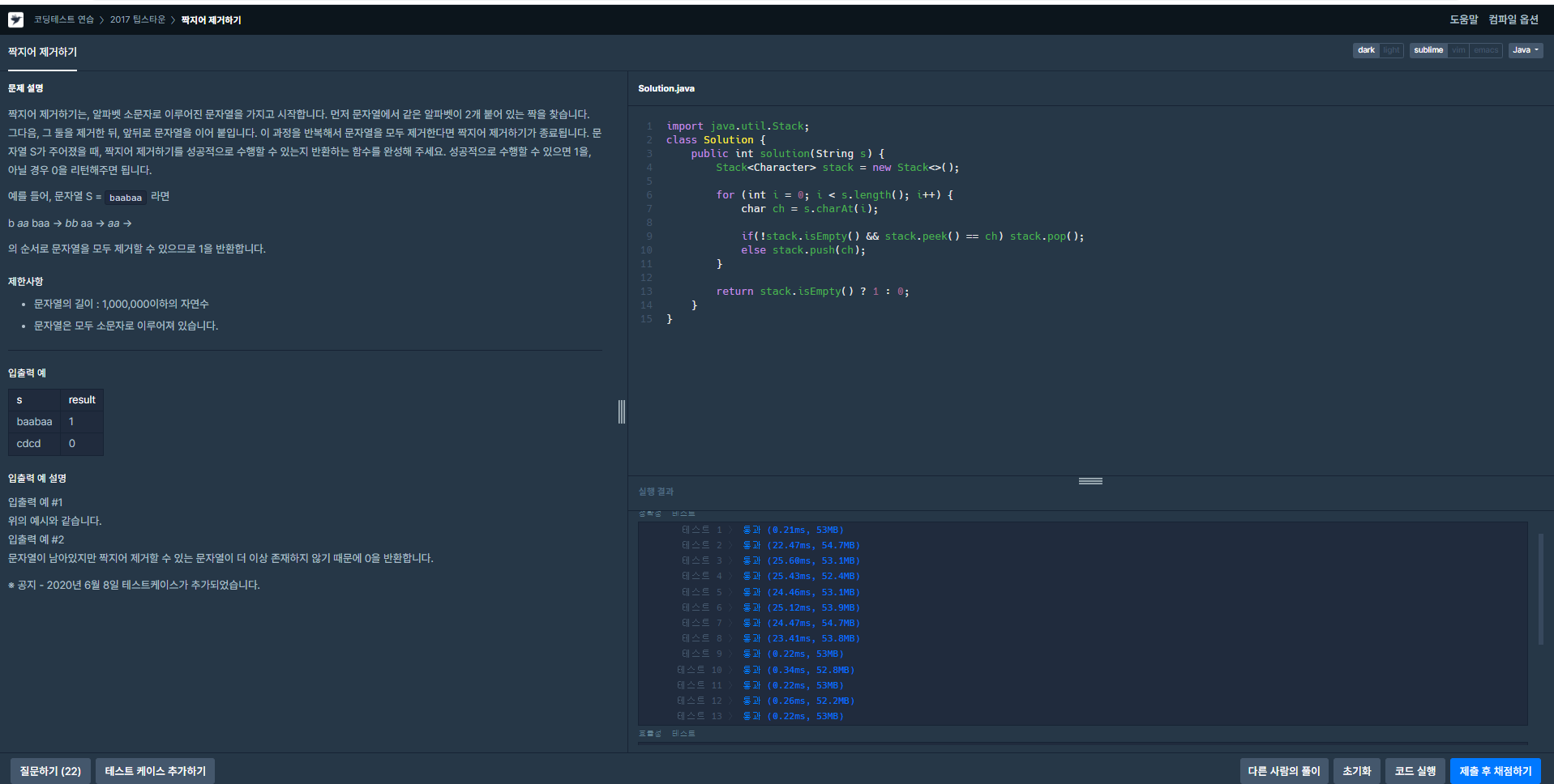 짝지어 제거하기는, 알파벳 소문자로 이루어진 문자열을 가지고 시작합니다. 먼저 문자열에서 같은 알파벳이 2개 붙어 있는 짝을 찾습니다. 그다음, 그 둘을 제거한 뒤, 앞뒤로 문자열을 이어 붙입니다. 이 과정을 반복해서 문자열을 모두 제거한다면 짝지어 제거하기가 종료됩니다. 문자열 S가 주어졌을 때, 짝지어 제거하기를 성공적으로 수행할 수 있는지 반환하는 함수를 완성해 주세요. 성공적으로 수행할 수 있으면 1을, 아닐 경우 0을 리턴해주면 됩니다.