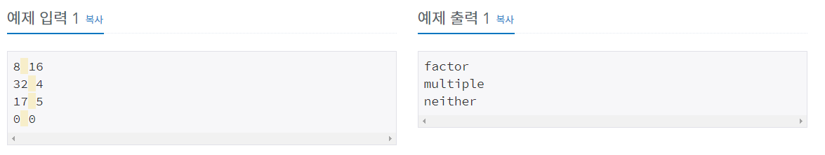 각 테스트 케이스마다 첫 번째 숫자가 두 번째 숫자의 약수라면 factor를, 배수라면 multiple을, 둘 다 아니라면 neither를 출력한다.