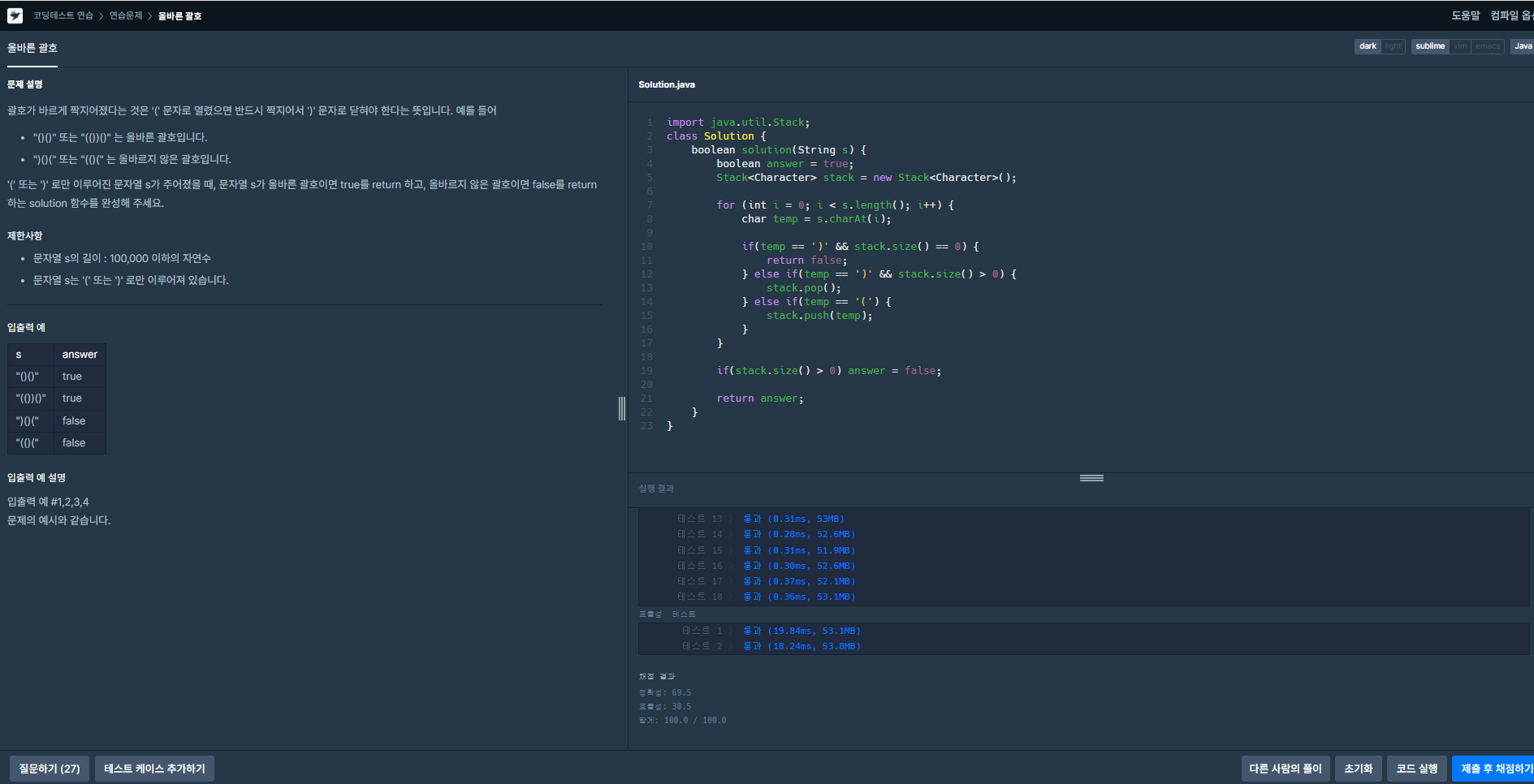 '(' 또는 ')' 로만 이루어진 문자열 s가 주어졌을 때, 문자열 s가 올바른 괄호이면 true를 return 하고, 올바르지 않은 괄호이면 false를 return 하는 solution 함수를 완성해 주세요.