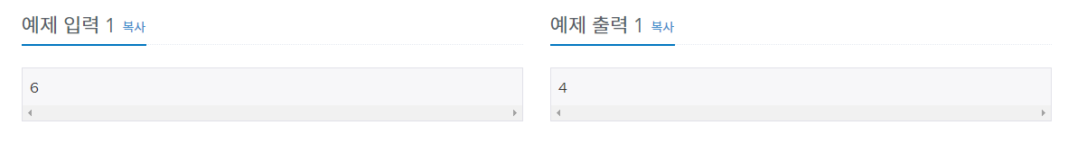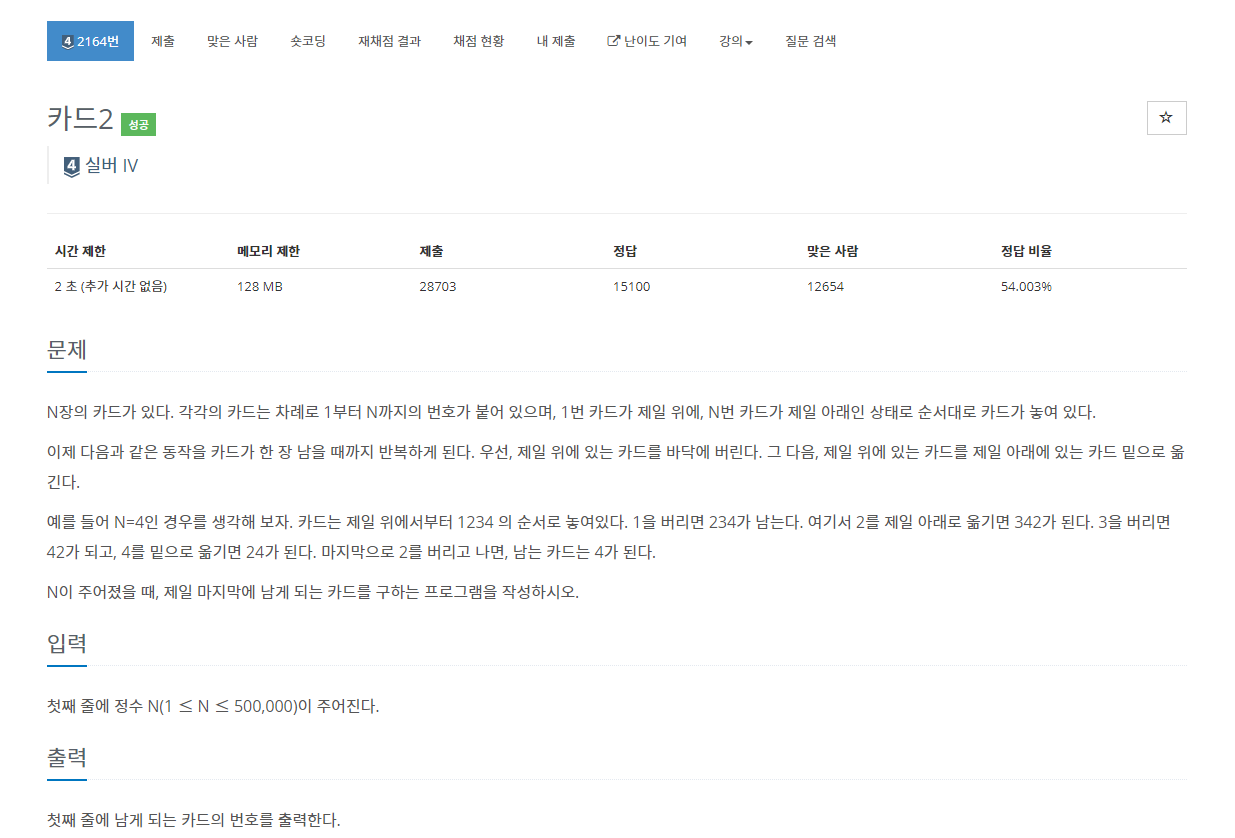 예를 들어 N=4인 경우를 생각해 보자. 카드는 제일 위에서부터 1234 의 순서로 놓여있다. 1을 버리면 234가 남는다. 여기서 2를 제일 아래로 옮기면 342가 된다. 3을 버리면 42가 되고, 4를 밑으로 옮기면 24가 된다. 마지막으로 2를 버리고 나면, 남는 카드는 4가 된다.