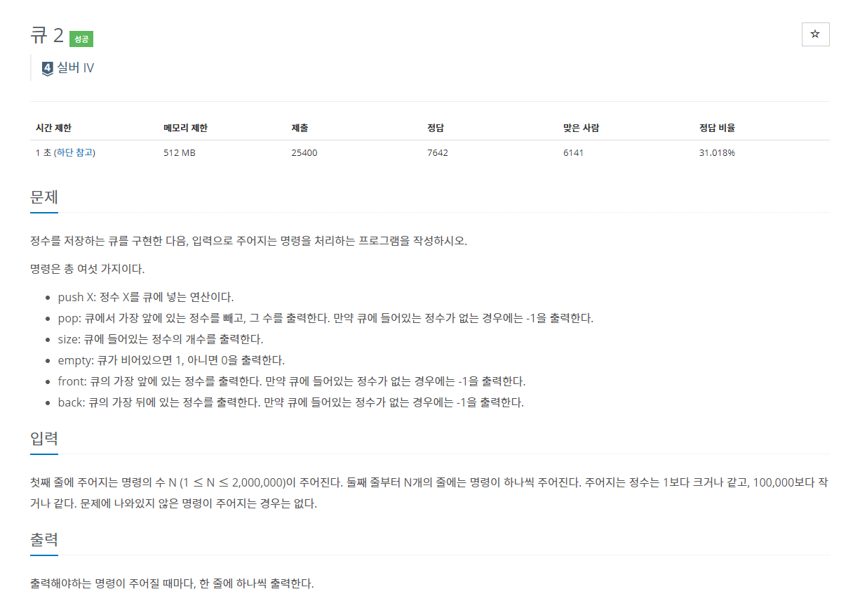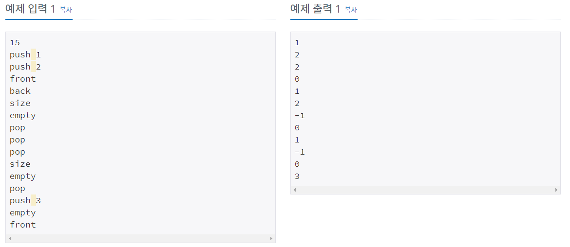 정수를 저장하는 큐를 구현한 다음, 입력으로 주어지는 명령을 처리하는 프로그램을 작성하시오.
